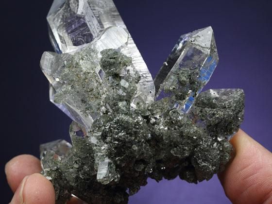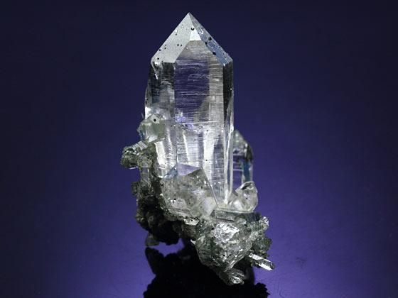 底部にはモスグリーンのクローライトを伴い、一部には黄金色の繊細なルチルも見れらます。