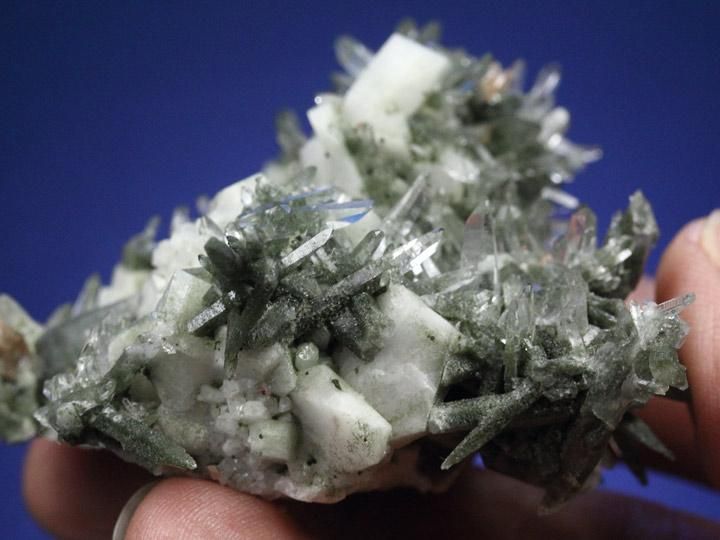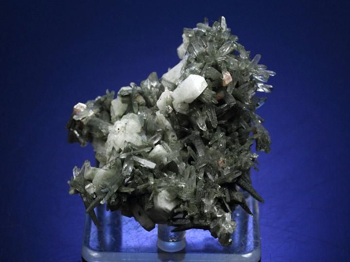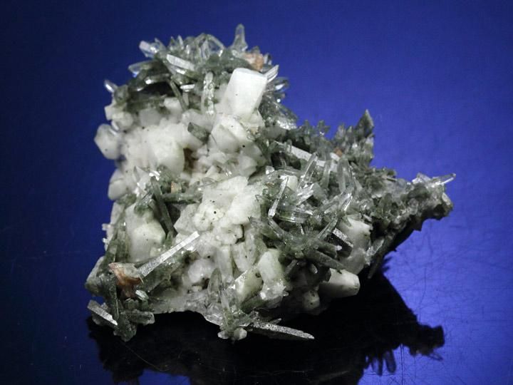 底部やポイントの合間には白いアルバイト(曹長石)を伴い、鋭利なグリーンの姿に真っ白な結晶がやわらかな風合いをもたらしています。