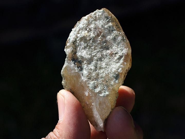 モスグリーンのクローライトも伴い、表面は大きく浸食されてゴツゴツとした箇所が見られます。