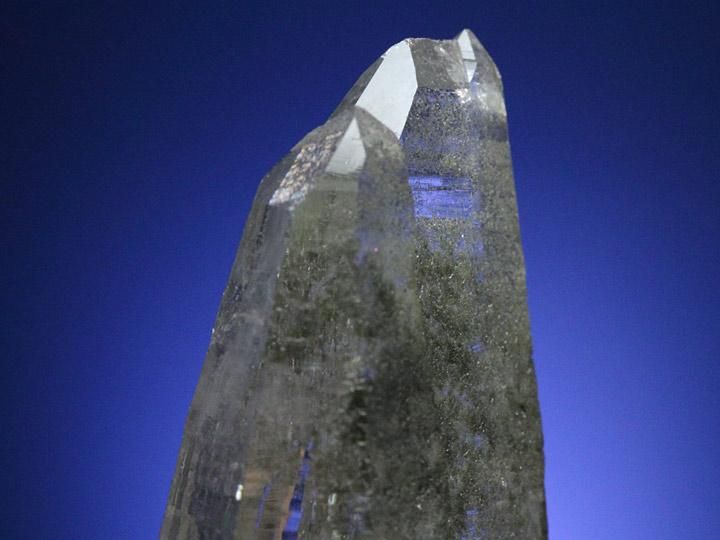 ツインサミットの山並みを想わせるような姿と穏やかに映し出されるクローライトのグリーンが味わい深い水晶ポイントです。