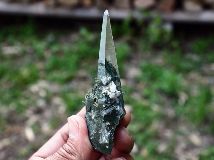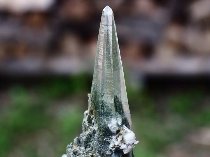 根元から中央部分までもこもことしたモスグリーンのクローライトを伴っています。