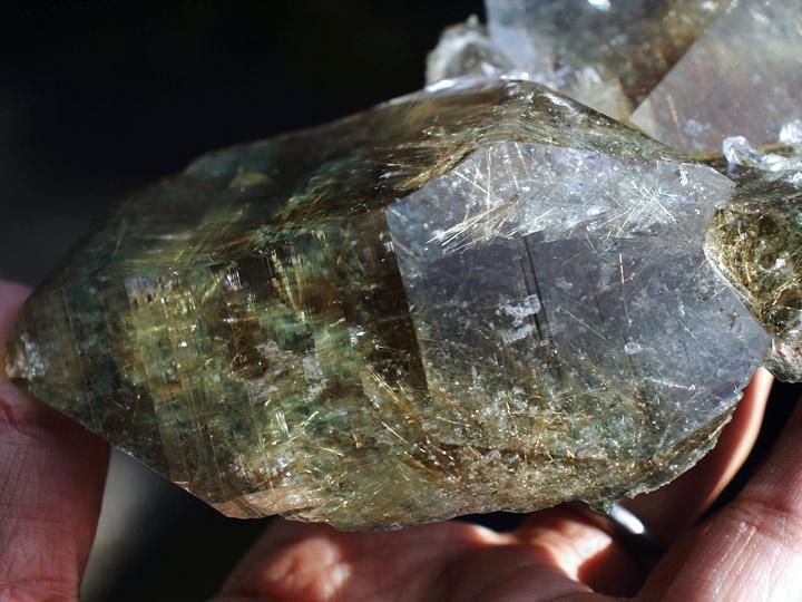 上から見ると、クリアーで大きな面から内部に広がるルチルやクローライトの見事なガーデン模様が映し出されています。
