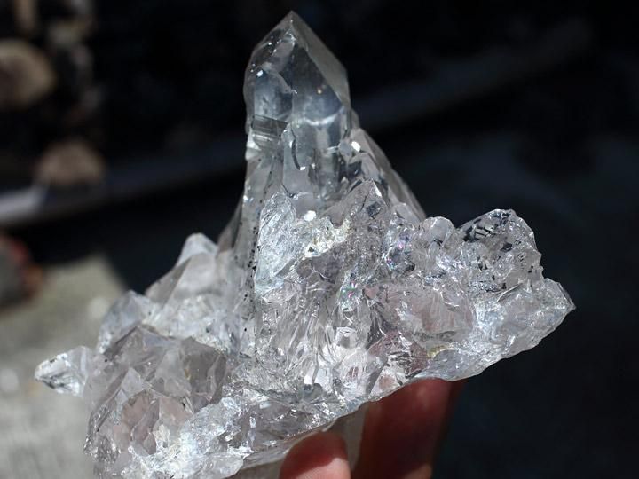 内部には僅かにモスグリーンのクローライトを伴い、小さなレインボーが輝いています。