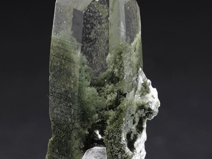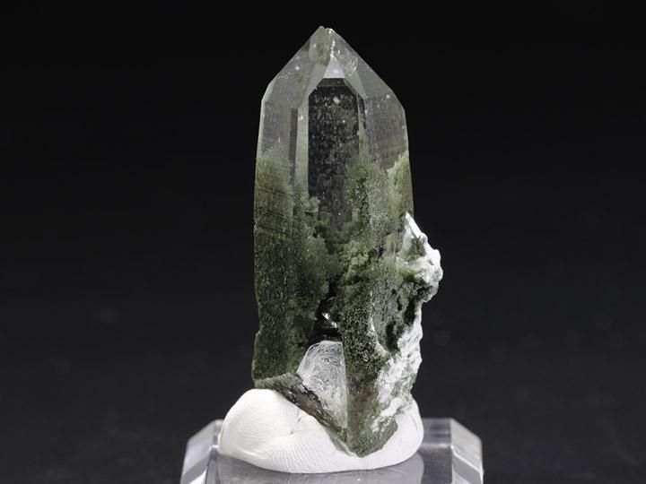 無色透明の結晶部分とクローライトのグリーンとのくっきりとしたコントラストが美しい水晶ポイントです。