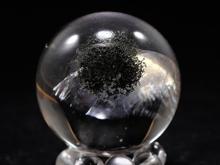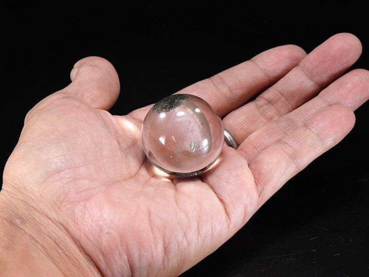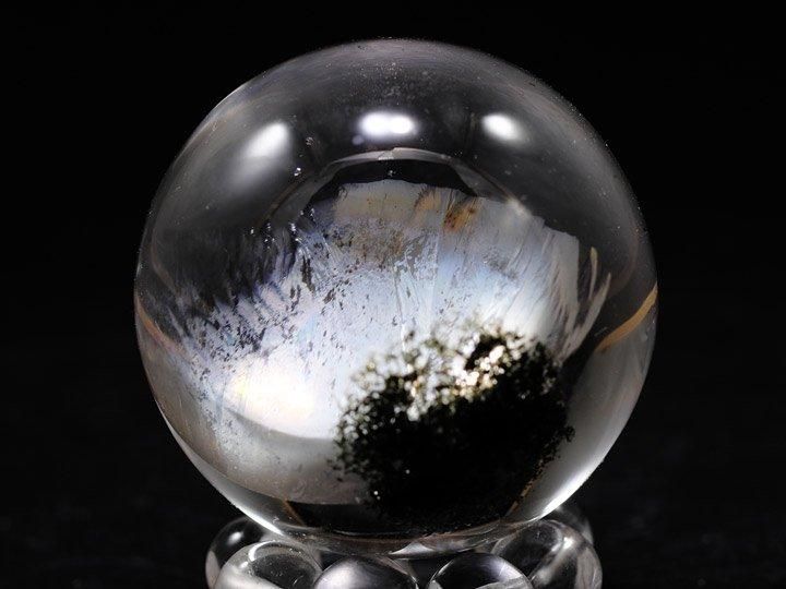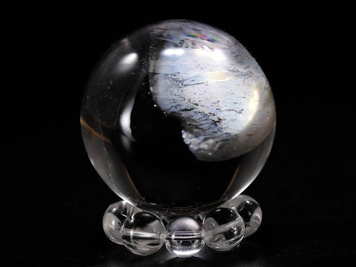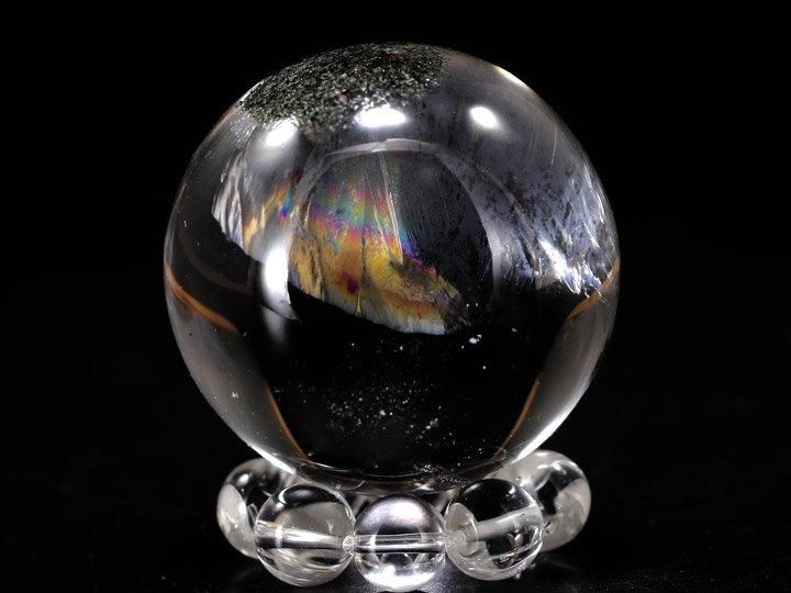 ネパールの職人が手作業で丁寧に磨いたガネーシュヒマール産のヒマラヤ水晶丸玉です。 透き通るようなクリアーな結晶です。サイドにはモスグリーンのクローライトを伴います。 内面のクラックに七色のレインボーがキラキラと輝いています。 角度によって小さな虹が映し出されます。 ヒマラヤ水晶ビーズの台座をお付けします。