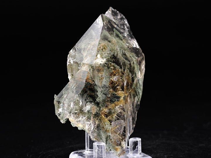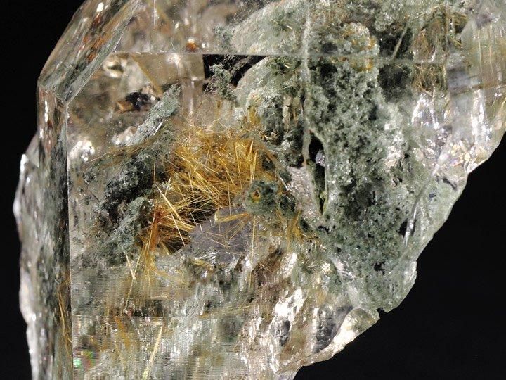 内面にはもこもことしたモスグリーンのクローライトを伴い、ところどころにとても繊細な針状のゴールデンルチルが伸びています。