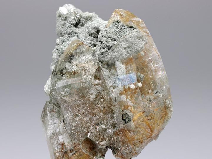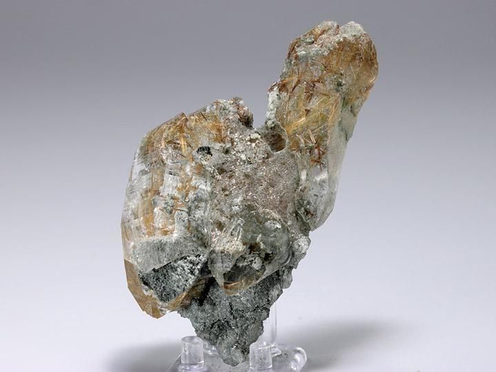 モスグリーンのクローライトを伴い、全体がゴツゴツと大きく侵食されています。