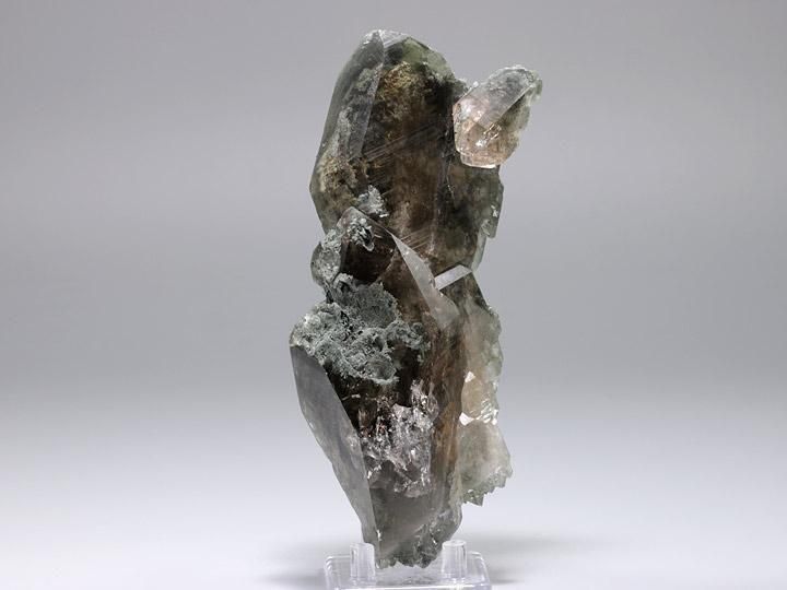 ゴツゴツとしたワイルドな形状と、スモーキーの色合いから除くクローライトやルチルの模様がどこか幻想的な水晶ポイントです。