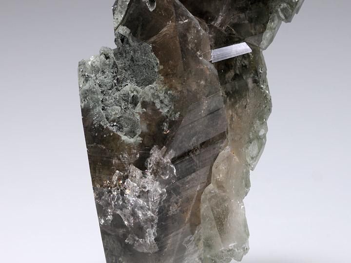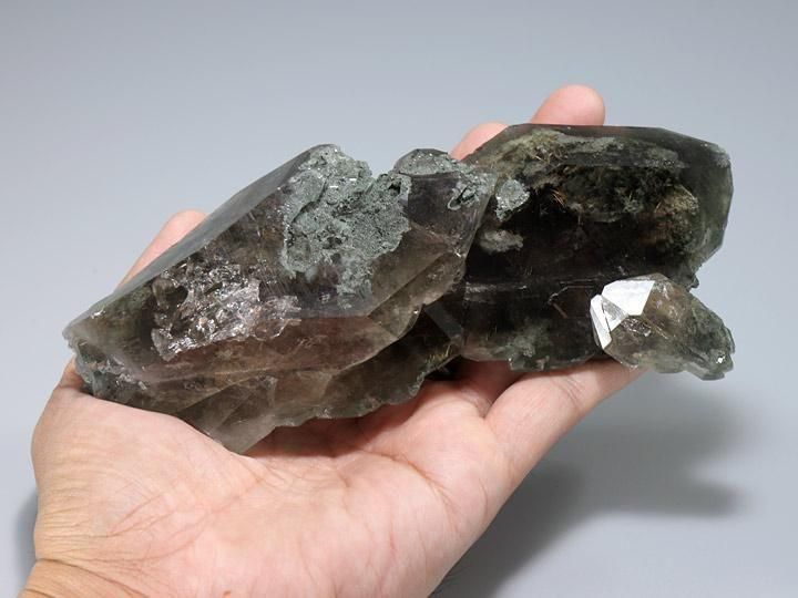 モスグリーンのクローライトを伴い、ゴツゴツと大きく侵食されています。